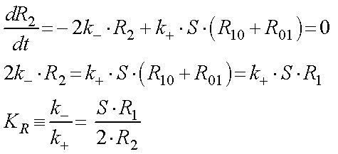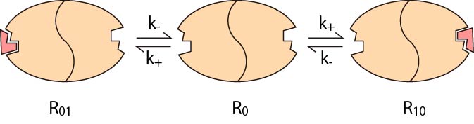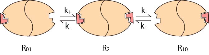 先のページでは,基質一つがついた状態を,R1,としましたが,結合サイトが2つあるので,二状態あります. それを,R10,R01とすると,
