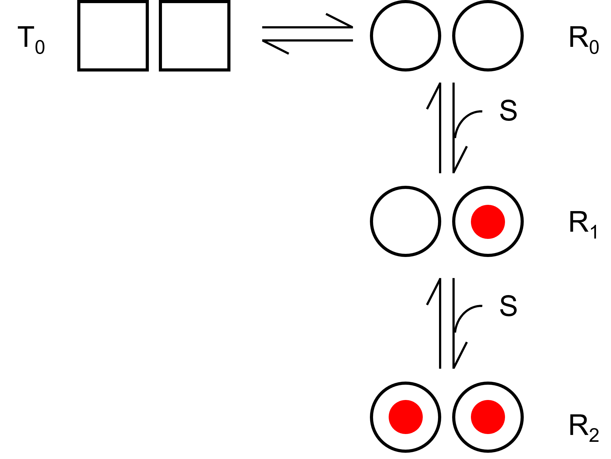 まずはT状態とR状態を遷移するモデルを考え,基質SはR状態のみに結合すると考えましょう.