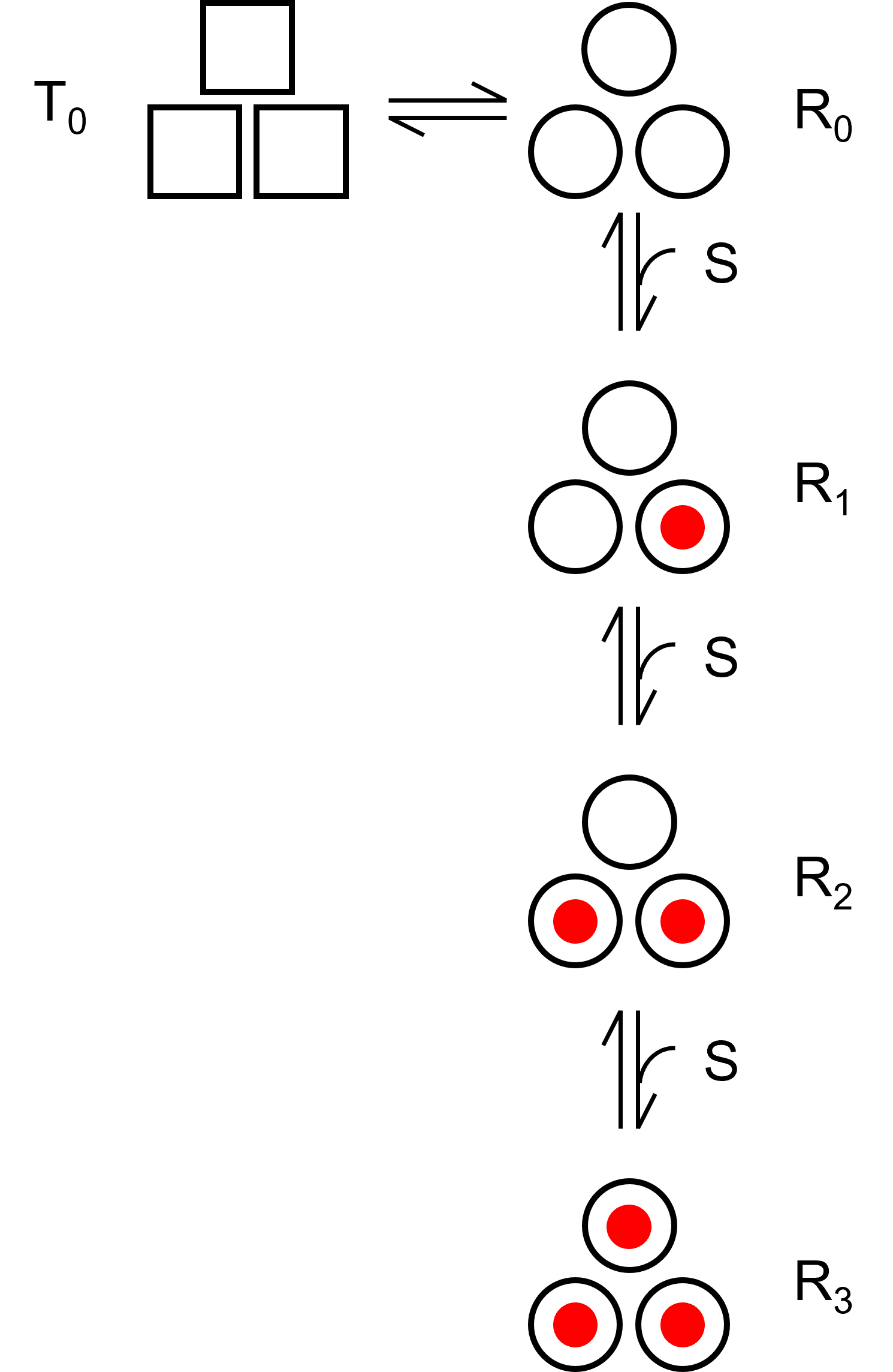 まずはT状態とR状態を遷移するモデルを考え,基質SはR状態のみに結合すると考えましょう.
