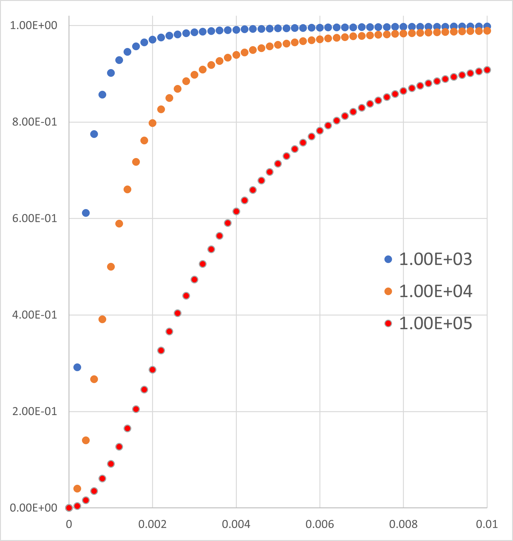 Lが小さい時(ここではL=1,000,青)ではS字型にはならず,一般的な二状態の平衡反応となります.