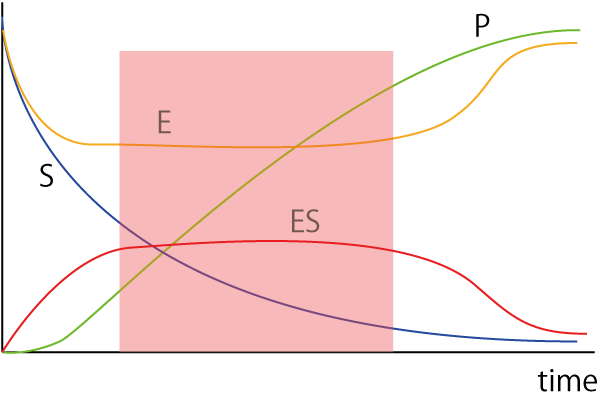 が成り立ちます.生成速度,[ES]の時間変化は,