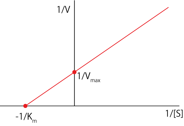 さらには,Y軸との交点が,\( \Large \frac{1}{V_{max}} \),X軸との交点が,\( \Large \frac{1}{K_m} \),となります.