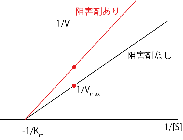 グラフで表すと,Km値(X切片)は変わらず,Vmax値(Y切片)は変化するので,
