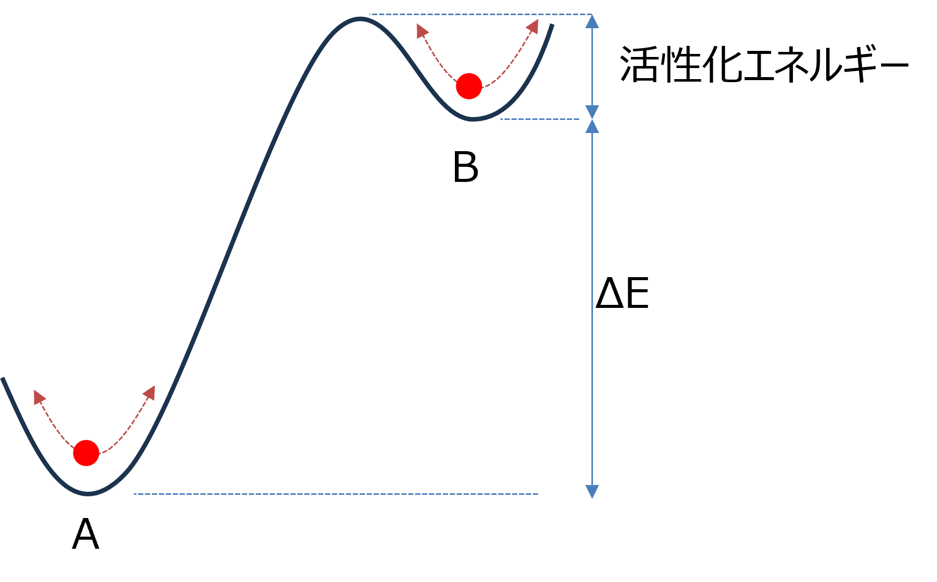 A → B : 活性化エネルギー + ΔE,を超えるエネルギー状態の場合,Bに遷移する