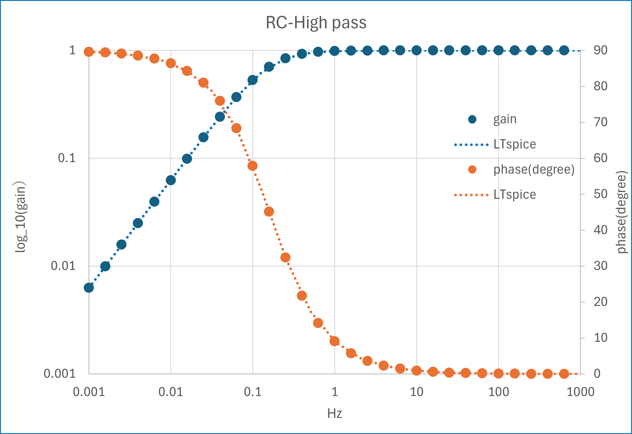 先程のローパスフィルタは,コンデンサ部の電圧でしたが,ハイパスフィルタの場合は,抵抗部の電圧となります.