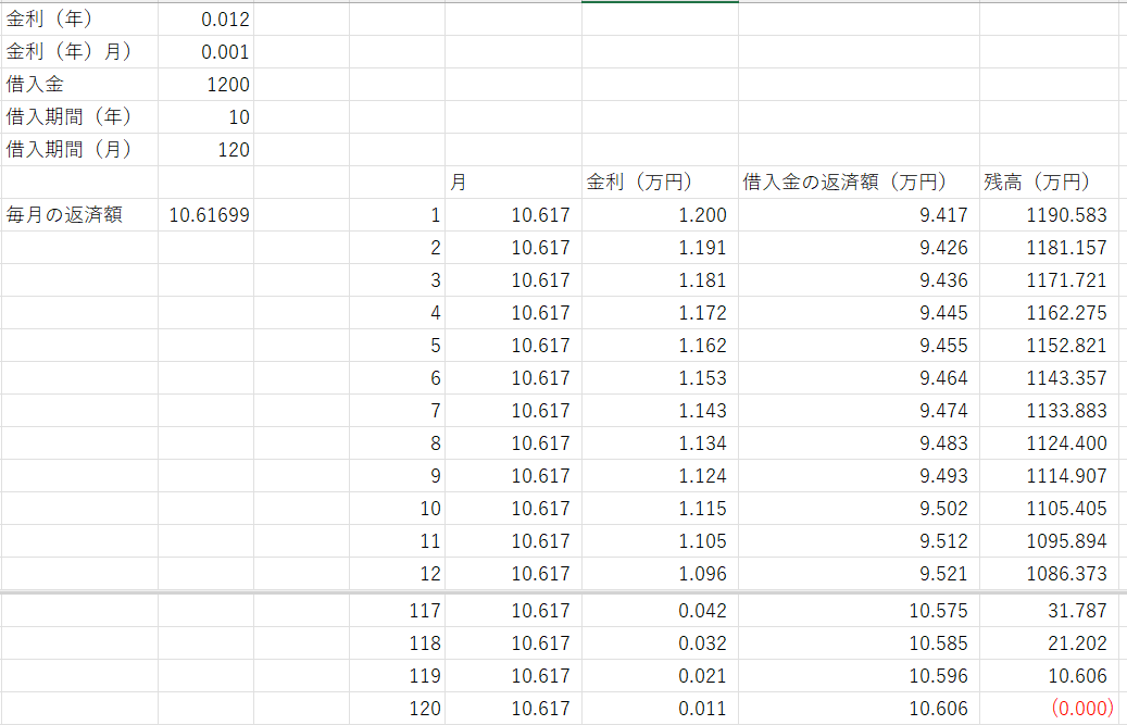 一般的には年の金利が表示されていますが,一般的には毎月返却することになるので年金利の1/12の月ごとの金利が計算には使われます.