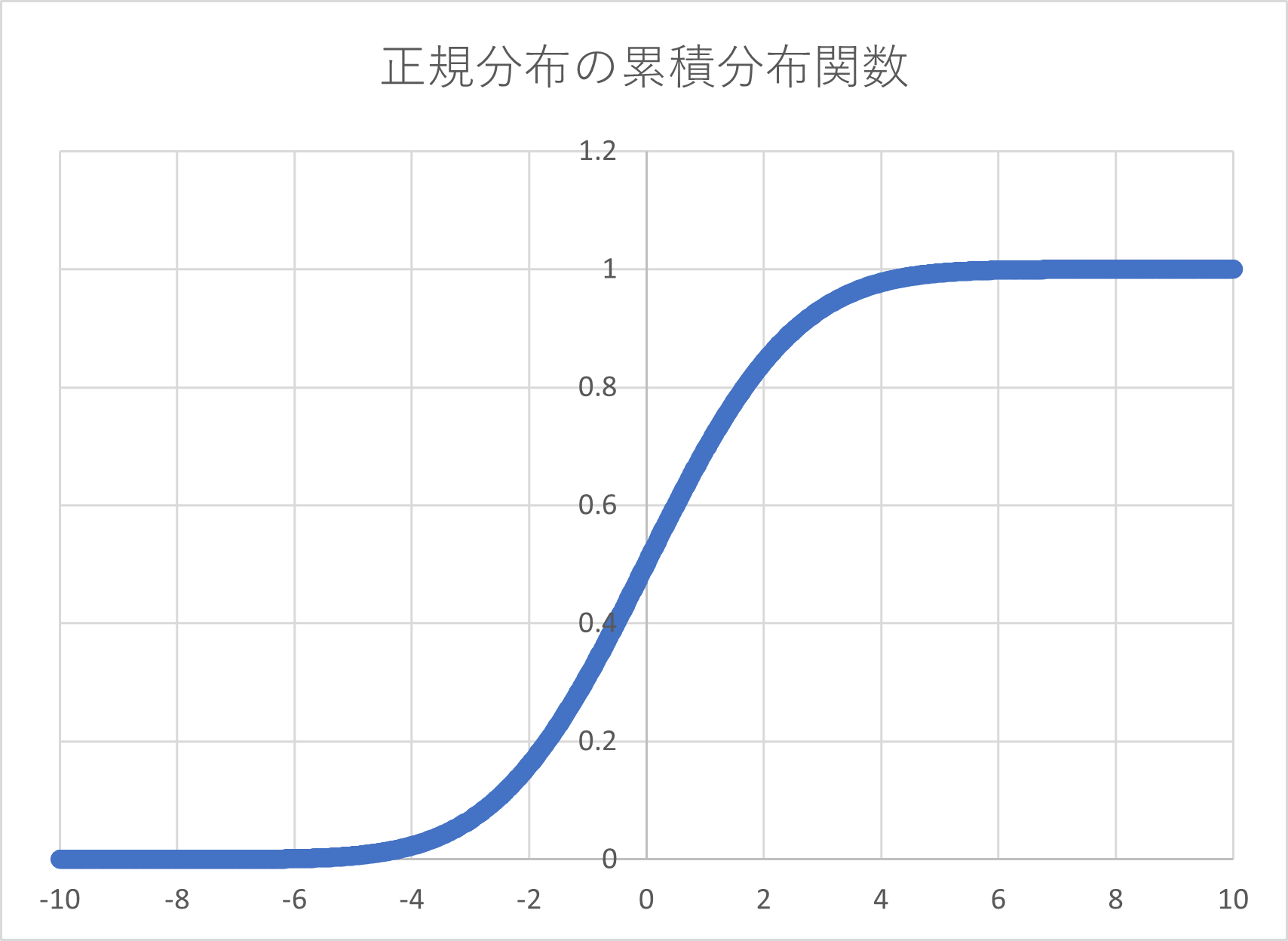 ・NORM.S.DIST(x, TRURE) : 標準正規分布(μ=0, σ=1)の累積分布関数