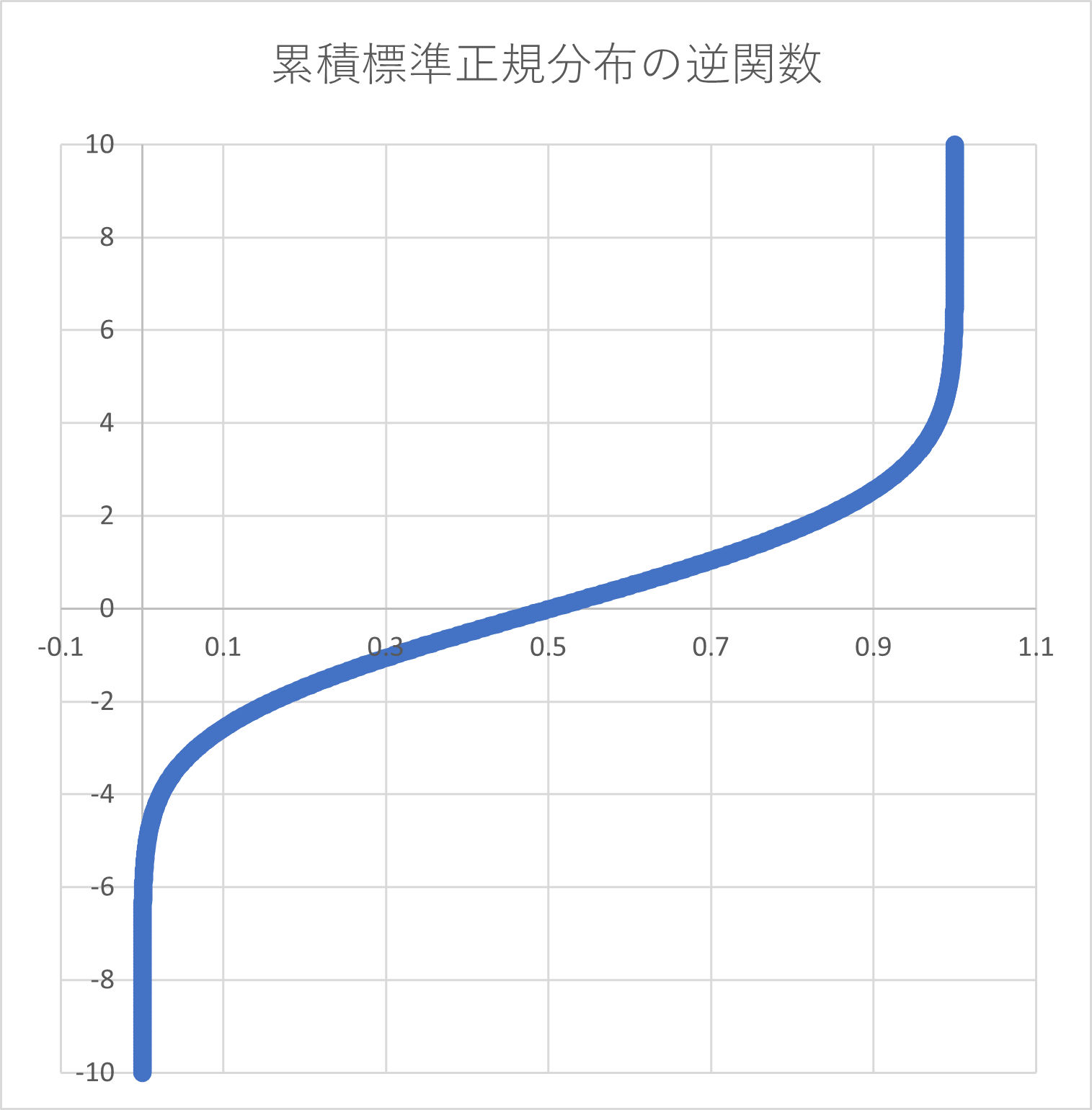 逆関数は,上図の「正規分布の累積分布関数」のX,Yをいれかえたものとなり,