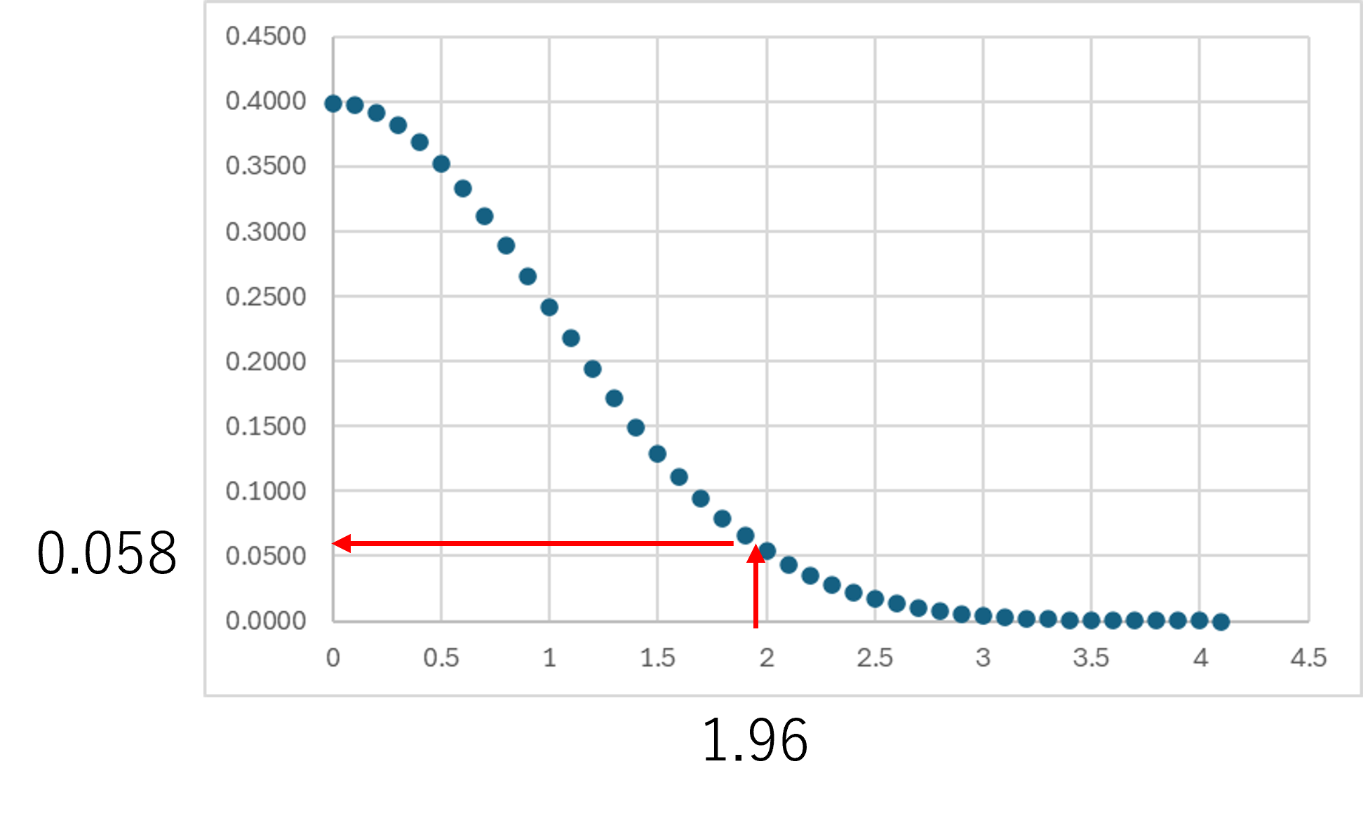 確認のために,μ=0,σ=1の標準正規分布では,95%の信頼空間の値が1.96でした.