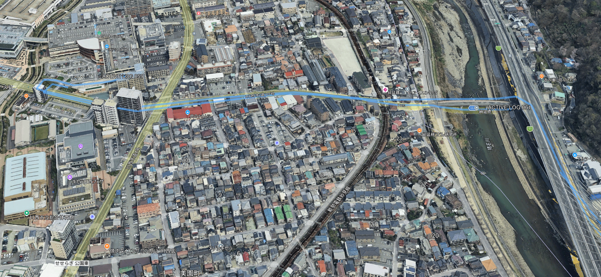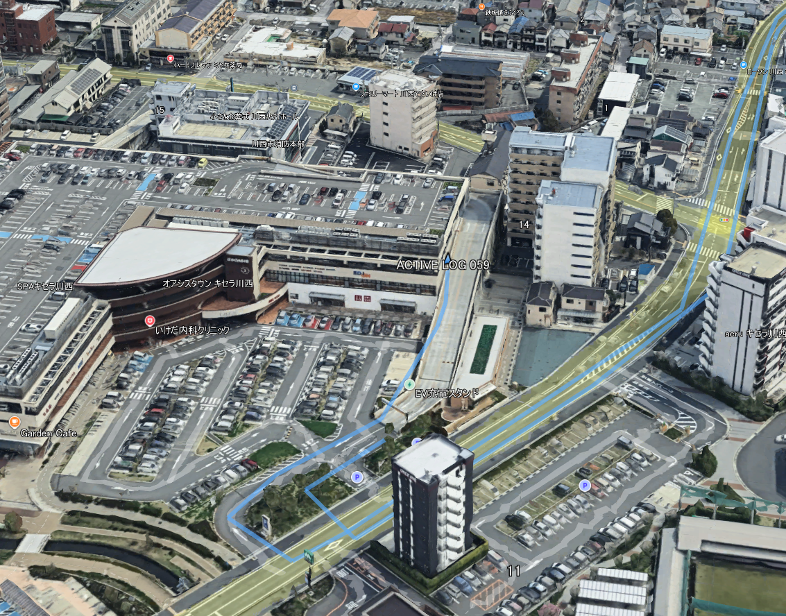 水色の線がトラック情報で,BaseCampから,エクスポートした*.GPXファイルをGoogleEarchで開きました.