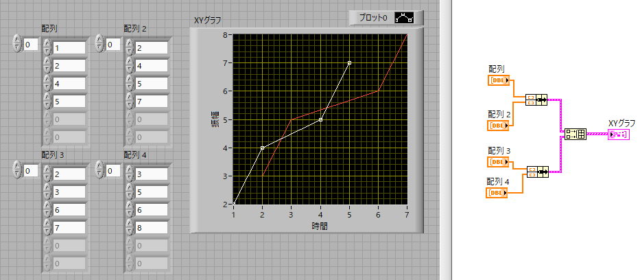 プロット形式:グラフアイコン上で右クリックして変更 or フロントパネル右上の”プロット0”を右クリック