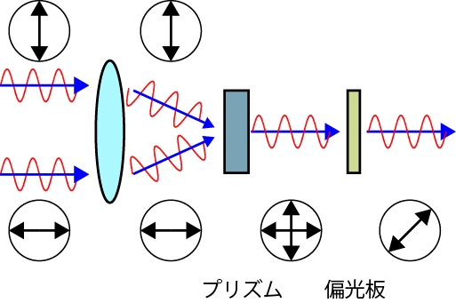 さて,二つに分かれた光は,レンズ,プリズム,偏光板を通して,合成されます.