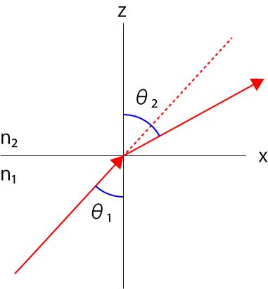 入射光:\(\Large u_1 \ (x,z,t) = A_0 \ exp \left[ i \left( n_1 k_0 cos \theta_1 \cdot z+n_1 k_0 sin \theta_1 \cdot x- \omega t \right) \right] \)