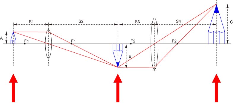 これら三つの矢印の部分は,拡大率は違いますが,同じ像を得られる場所です.