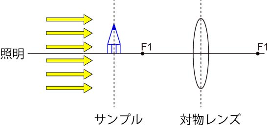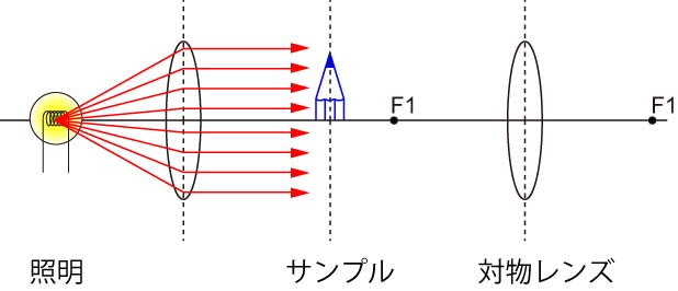 平行に光を照射すればいいのですね. 光源は一般的には点に近い(1点からではないですが)ものが多いですね,ハロゲン光,アーク光,など. 1点から発せられた光を平行光に変える.... まさしくレンズの役割ですね.