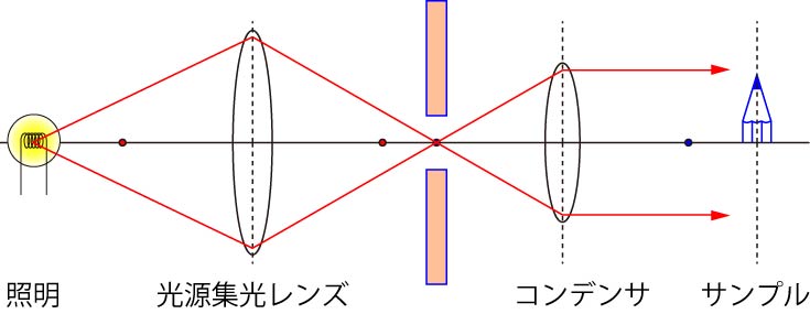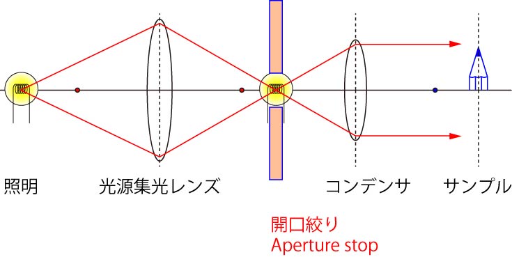 図では一点から発せられた光を示していますが,照明が点光源ではないので,中心以外からの光が絞りによって制限されるのです.