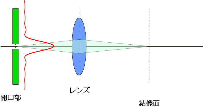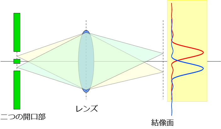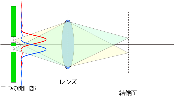 二つの開口部から発せられた波をレンズを通して結像させた場合