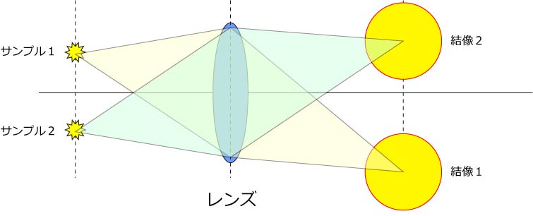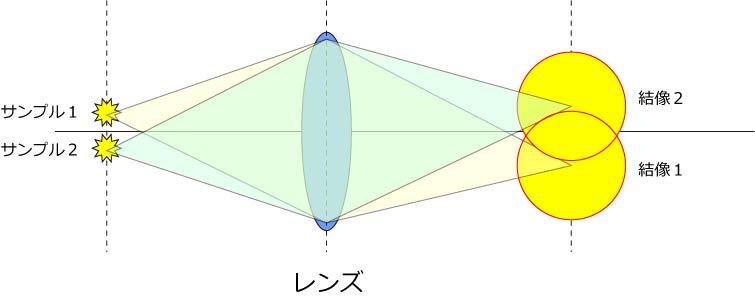 サンプル1とサンプル2の結像像が重なり合って,我々には二点から発せられた点と判断できなくなってきます.