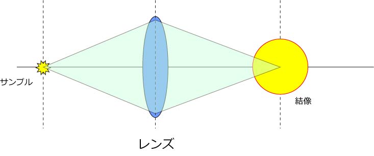 左の,サンプル,から発せられた光はレンズを通して,右側のある点に結像しますが,これがある広がりを持ってしまうのです.