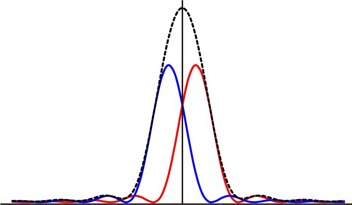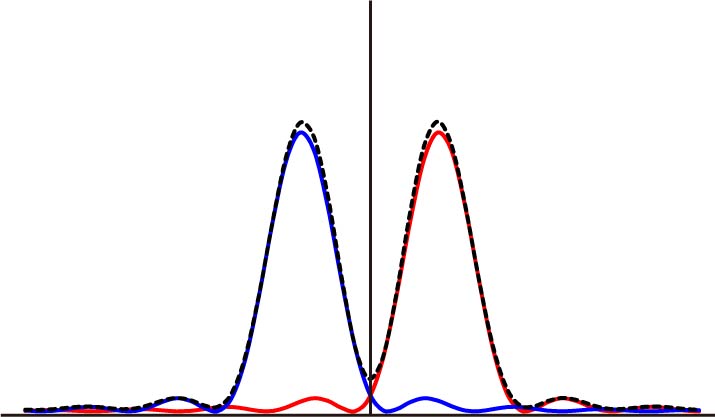 これは,ちょうど一つの強度分布(この場合は青)の強度が0になった点ともう一つの強度分布(この場合は赤)の中心と位置が一致する場合です.