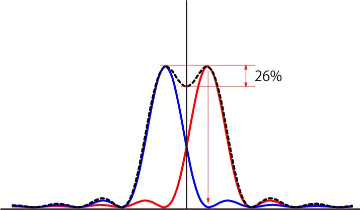 こうなると,合成強度を見ると,中心の強度が強くなり(ピークの26%減),区別しにくくなっていますね.