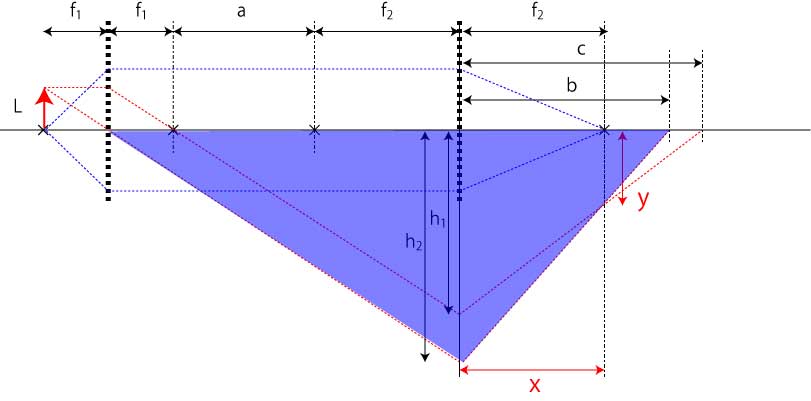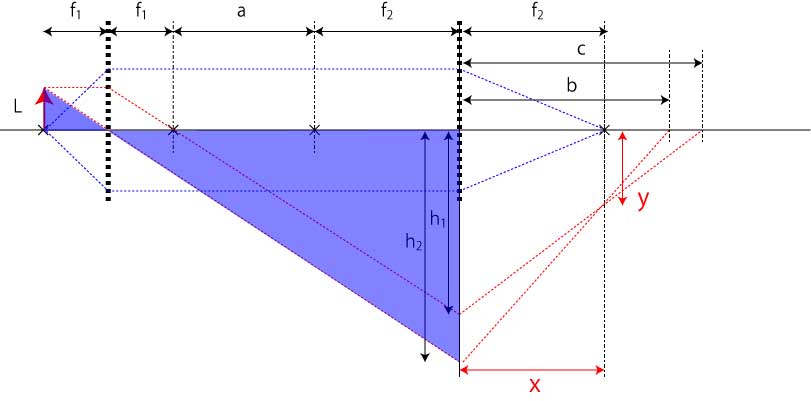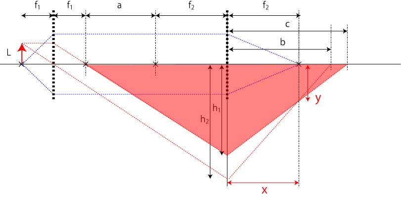 \(\Large \frac{L}{f_1} = \frac{h_2}{a+f_1+f_2}\)