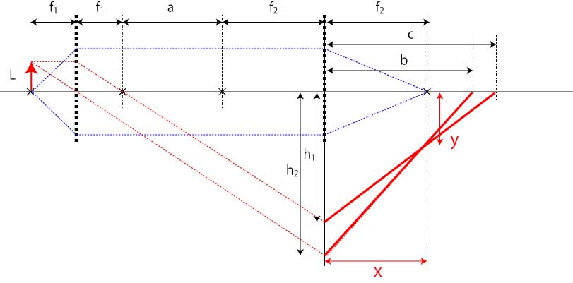\(\Large \frac{L}{f_1} = \frac{h_1}{a+f_2}\)