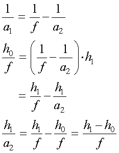 最初の式はレンズの公式,二つ目の式はレンズの左側の三角形の合同から導き出せますね.