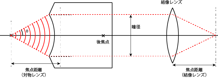 \(\Large \begin{align*} 瞳径 &= 2 \times 対物レンズの焦点距離 \times n \cdot sin \theta \\