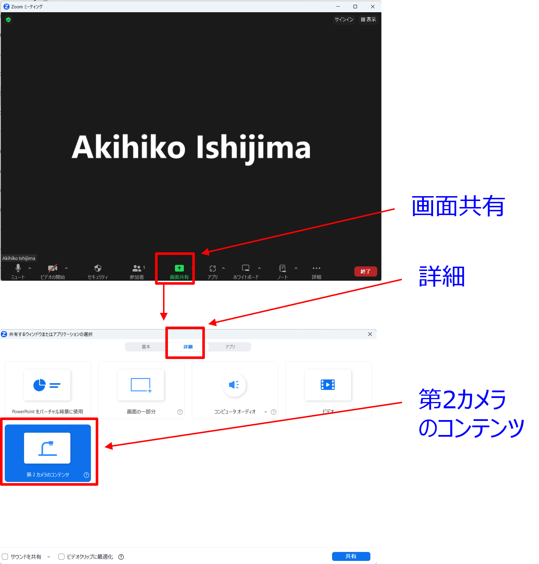 OBSからのカメラ映像を共有するには, ”画面共有” -> "詳細" -> "第2カメラのコンテンツ" を選択する