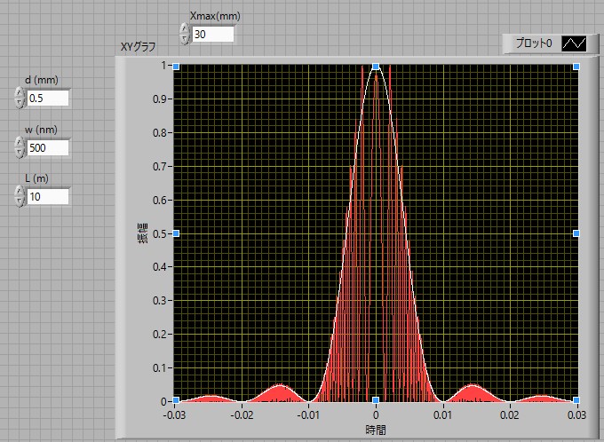 このように,多重スリットの場合と同様の形状となります.(d=0.5 mm, λ=500 nm, L=10 m)