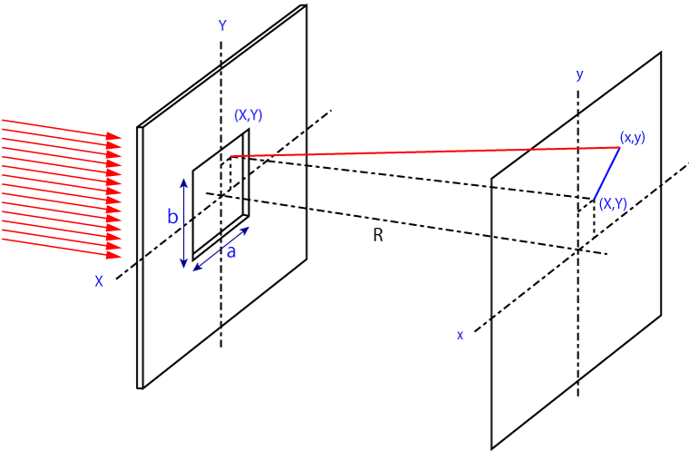 &=& \frac{E_0 e^{i ( \omega t - k R )}}{z} \int_{Aperture} e^{ ik \frac{(Xx+Yy)}{R}} ds \\