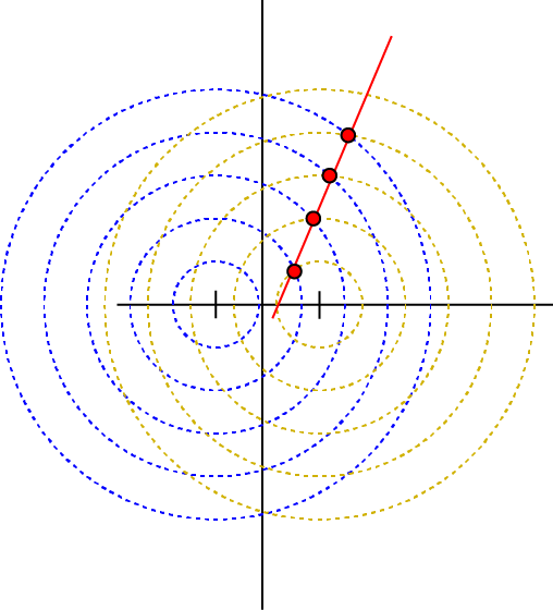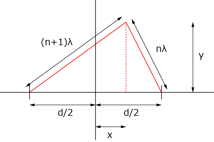 \(\Large \begin{eqnarray} y^2 &=& \{ (n+1) \lambda \}^2 - \left( \frac{d}{2} + x \right)^2 \\
