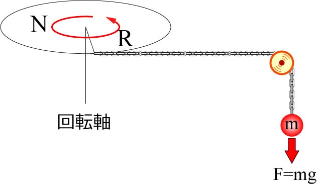 トルク,N,を発生する軸からrだけ離れたところに,ひもをつけ,その先におもりをつけます.