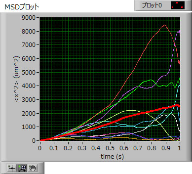赤の太線が10回試行の平均値で,何とか直線に近いですが,それ以外はばらばらです.