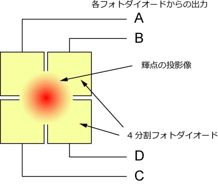 このフォトダイオードを複数(2個もしくは4個)使って,輝点の重心位置の変化を計測するのです.
