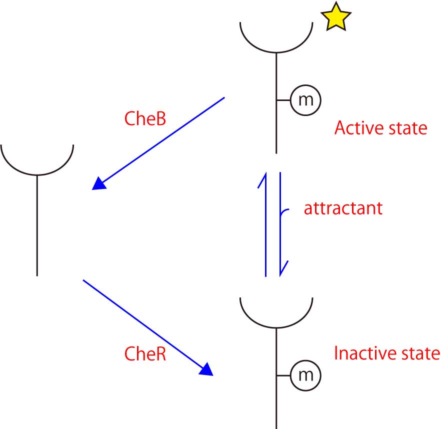 メチル化レセプター全濃度が増加するので,メチル化活性化レセプター(Xm*)の数も増加し,適応後のメチル化活性化レセプター(Xm*)の数は,
