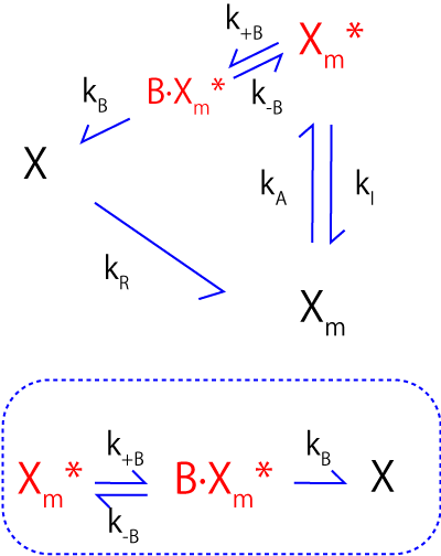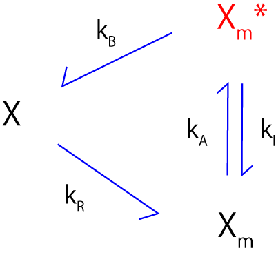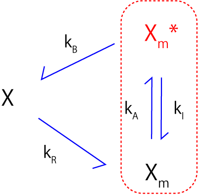 \(\Large \displaystyle \frac{d (X_m+X_m^*)}{dt} = k_R \cdot R-\frac{k_B \cdot B \cdot X_m^*}{K+X_m^*} \)